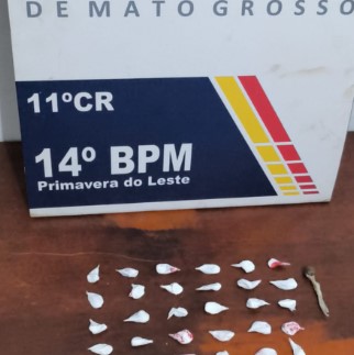 A Polícia Militar prendeu um homem por tráfico ilícito de drogas na tarde desta quarta-feira (11), por volta das 17h30, no bairro Primavera III, em Primavera do Leste. A guarnição do CPU realizava rondas pela Rua Mangueira quando visualizou um indivíduo conduzindo uma motoneta Honda Bis preta, placa NJA-9075, em desacordo com o Código de Trânsito Brasileiro. Imediatamente, os policiais acionaram sinais sonoros e luminosos para realizar a abordagem. No entanto, o suspeito tentou se afastar e, durante o acompanhamento, dispensou um objeto ao solo. Logo depois, a equipe conseguiu interceptá-lo nas proximidades da praça do bairro.