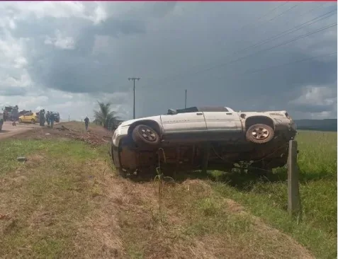 Com a força do impacto, o carro rodou na pista. Já a caminhonete saiu da rodovia e capotou às margens da via.