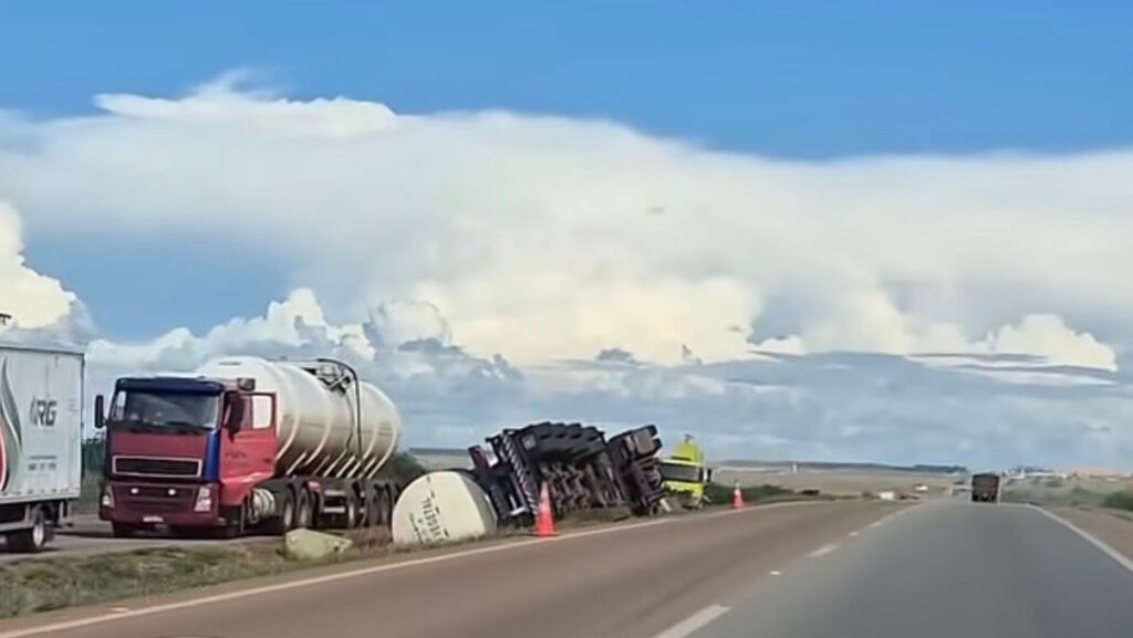 Até o momento, não há informações oficiais sobre o estado de saúde do condutor nem sobre as causas do tombamento. Imagens registradas por populares mostram o caminhão já imobilizado fora da pista, indicando que o acidente pode ter ocorrido momentos antes do flagrante.