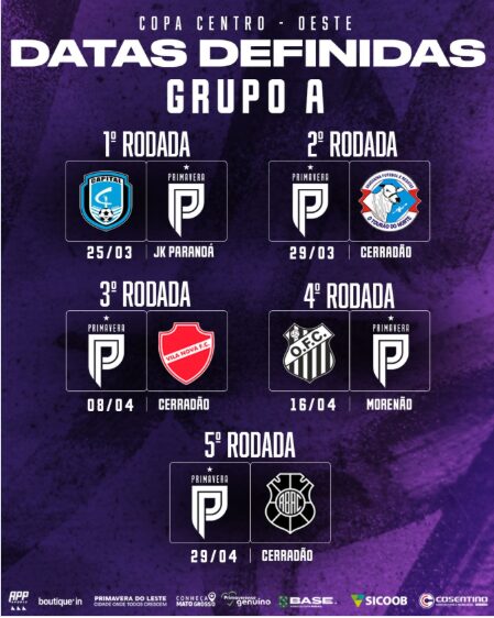 Após a estreia em Brasília, o Primavera contará com uma sequência decisiva no estádio Cerradão, em Primavera do Leste. No dia 29 de março, o Gigante Roxo enfrentará o Araguaína-TO diante de sua torcida. Em seguida, no dia 8 de abril, a equipe receberá o Vila Nova-GO em mais um confronto importante pela fase inicial. Logo depois, o time ainda viajará para encarar o Operário-MS no dia 16 de abril. Na sequência do calendário, o Primavera voltará novamente ao Cerradão para enfrentar o Rio Branco-ES no dia 29 de abril. Dessa forma, a equipe terá oportunidades importantes de somar pontos jogando em casa e fortalecer a campanha na competição regional.